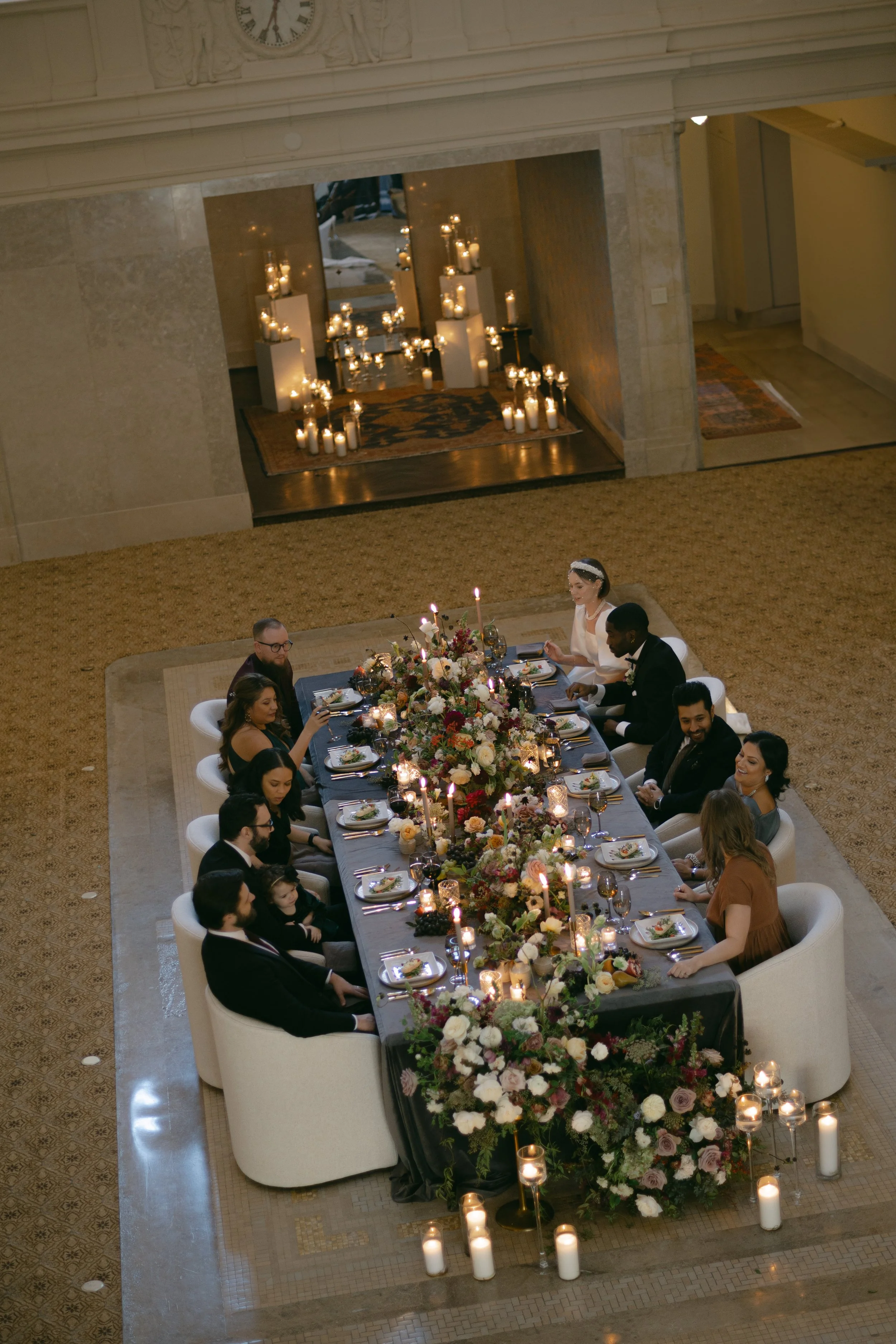 Upon entering, guests were immediately immersed into the rich history of the space and felt transported elsewhere. We crafted lush dutch master’s inspired floral pieces, each unique in their own composition, that dramatically overflowed a long head table and were styled alongside clusters of fruit. A stunning display of candles filled the table and surrounding spaces to create a glowing atmosphere of romance. The grand piano was surrounded by naturalistic floral pieces that highlighted the dessert and fruit display for guests. With an inimitable team of professionals working together, every nook of the space was thoughtfully utilized to create intimate moments that delighted and captivated guests’ senses throughout the flow of the evening.